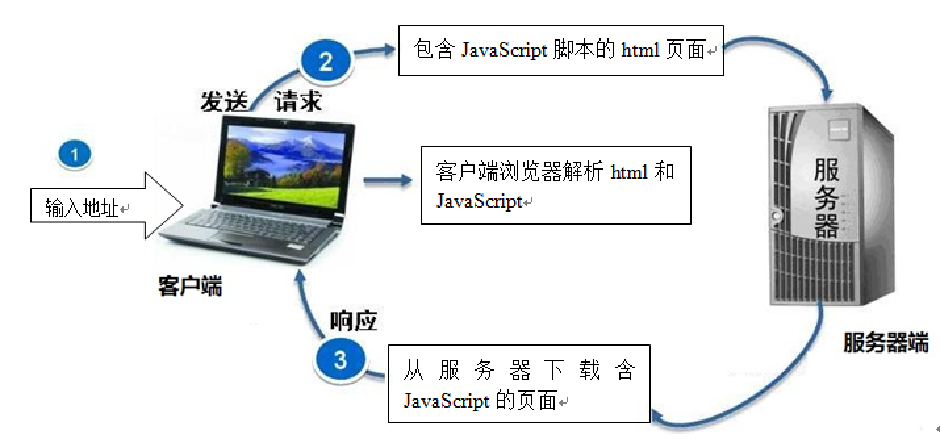 当客户端向服务器端请求页面时,服务器端将整个页面包含 JavaScript 的脚本代码发送到客户端,浏览器从上往下逐行读取并解析其中的 HTML 或脚本代码