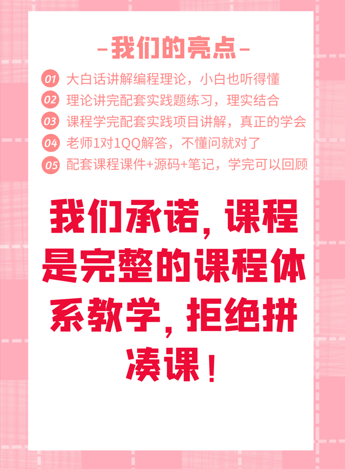 3、本课是完整体系课的一门课,课程有完整教学大纲,以企业用人标准建设课程,拒绝拼凑类课程教学!